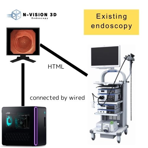 Pull images from existing endoscope equipment (such as existing endoscope equipment) via HDMI, etc., and install N-VISION’s AI software on the NVIDIA GPU-equipped equipment. Existing images can be streamed to the device to view 3D-enhanced images in real time. The display is a naked-eye 3D monitor. The connection method is basically HDMI, but depending on the manufacturer of the endoscope system, it may not be possible to output images.